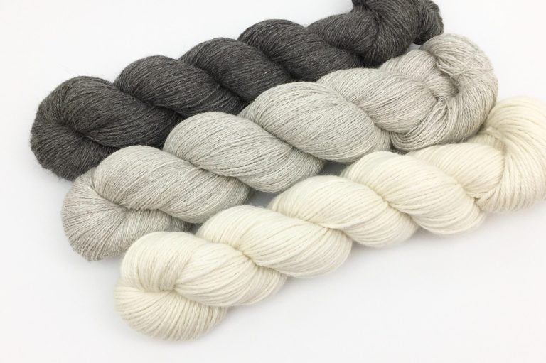 70% Baby Alpaka, 20% Seide, 10% Cashmere, Weiss, Hellgrau und Graphitegrau